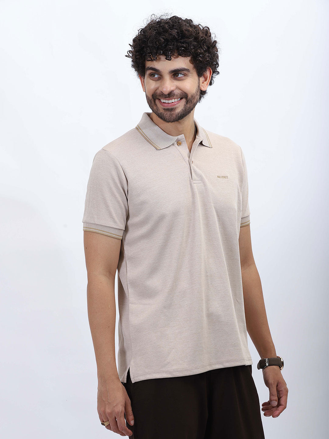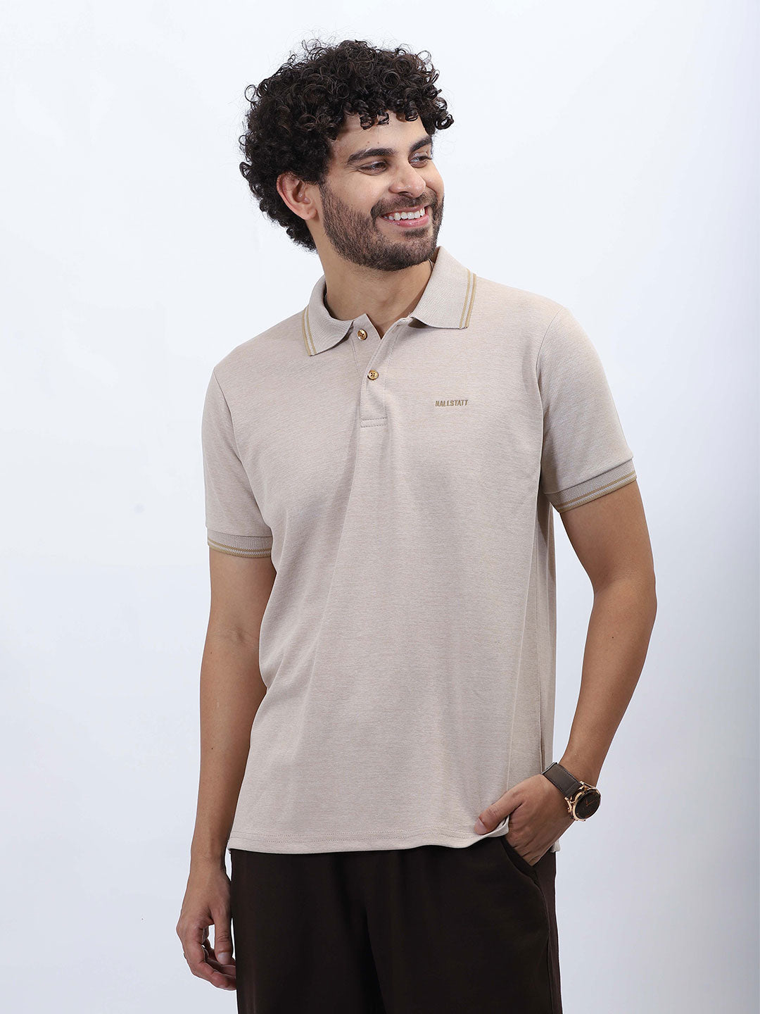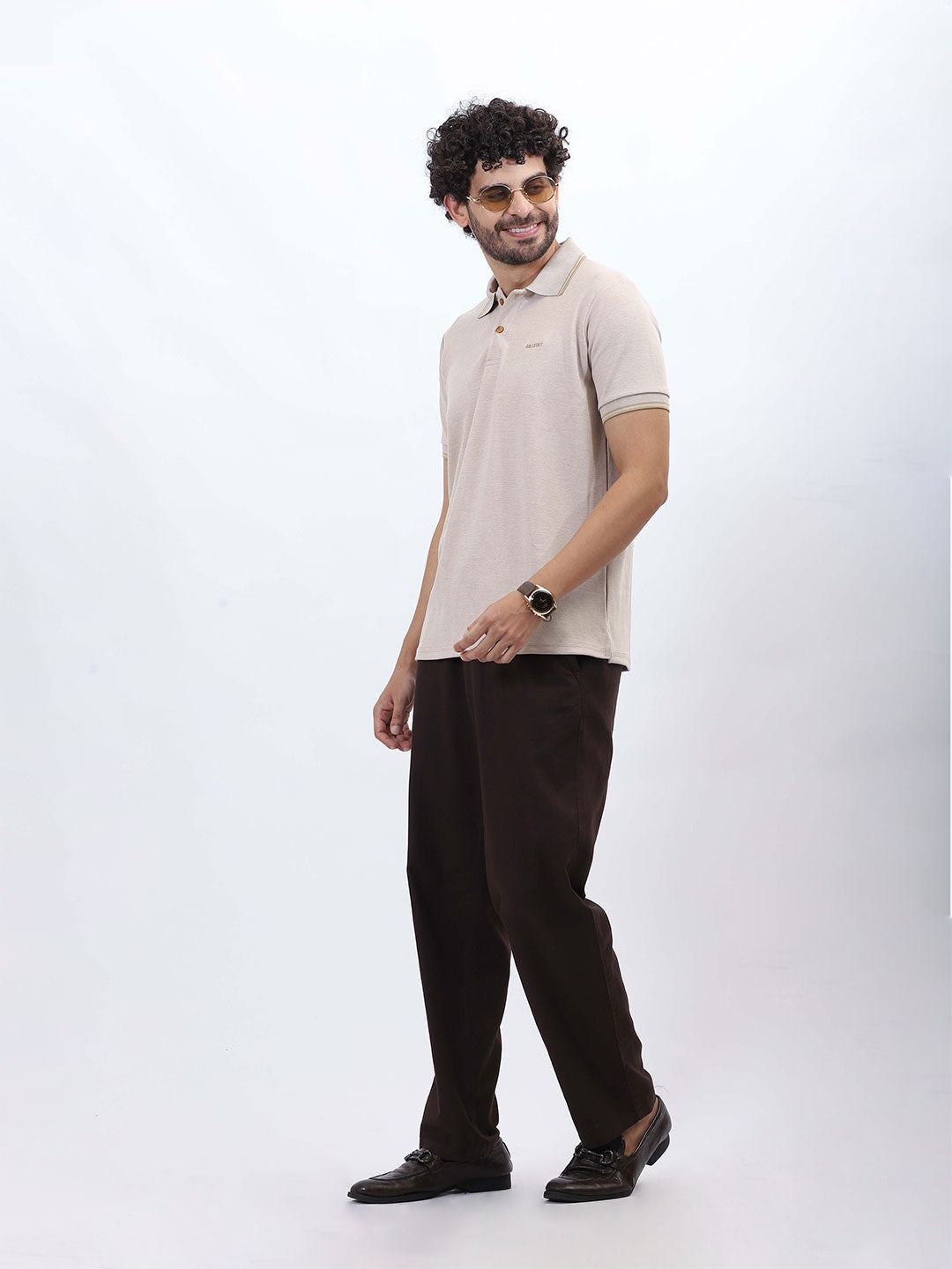 Feature: Soft piqué polo in desert beige paired with rugged olive cargo pants, combining comfort, utility, and timeless casual style.