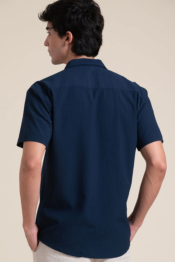 Feature: Classic navy shirt with a stylish Cuban collar and half sleeves, crafted from lightweight breathable fabric for a cool, casual look.