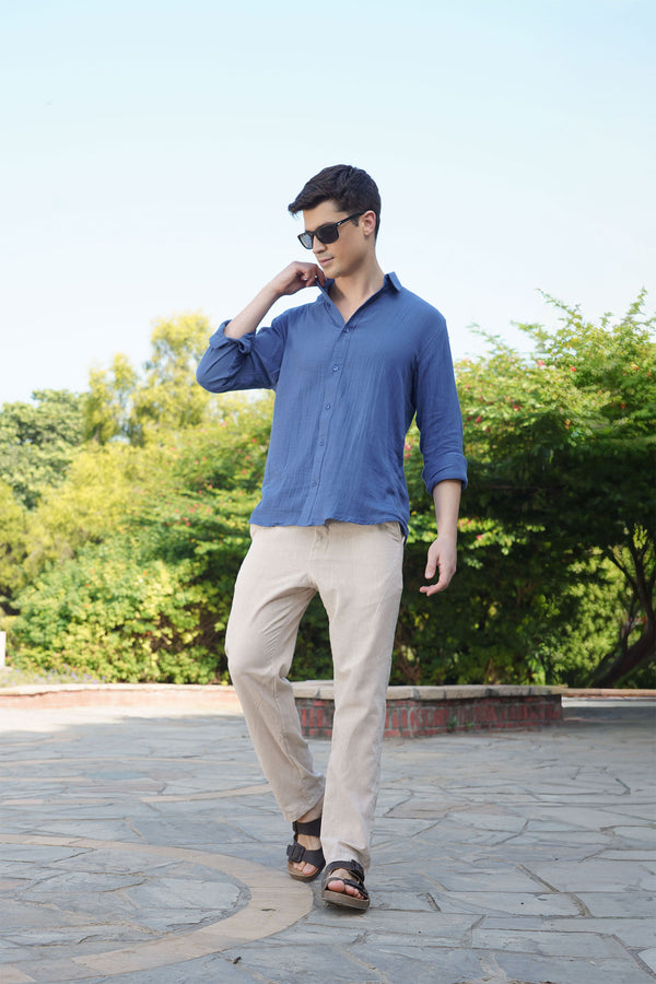 Stay effortlessly stylish with this Men’s Blue Casual Shirt, crafted from soft textured cotton for all-day breathability and comfort. Featuring a button-down front, standard collar, and double-button cuffs, this shirt blends a relaxed fit with refined detailing. The natural creases and lightweight fabric offer a laid-back, lived-in look that’s perfect for everyday wear.