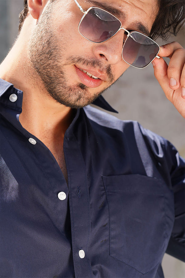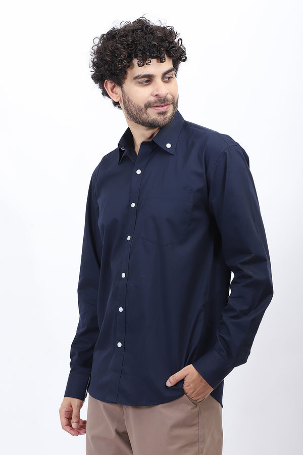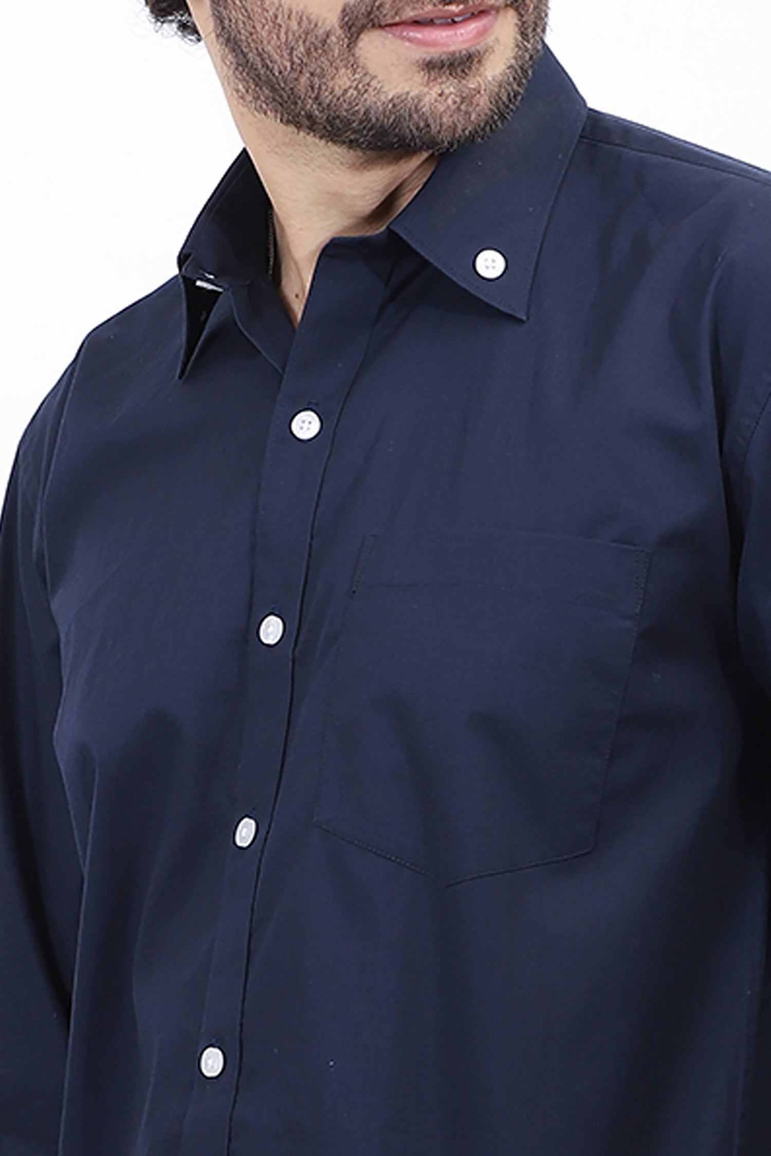 Make a subtle statement with this Navy Blue Button-Down Shirt, designed in a classic fit with a clean, minimalist silhouette. Made from lightweight cotton fabric, it features a button-down collar, white contrast buttons, single chest pocket, and buttoned cuffs. The crisp design adds polish while ensuring breathable comfort throughout the day.