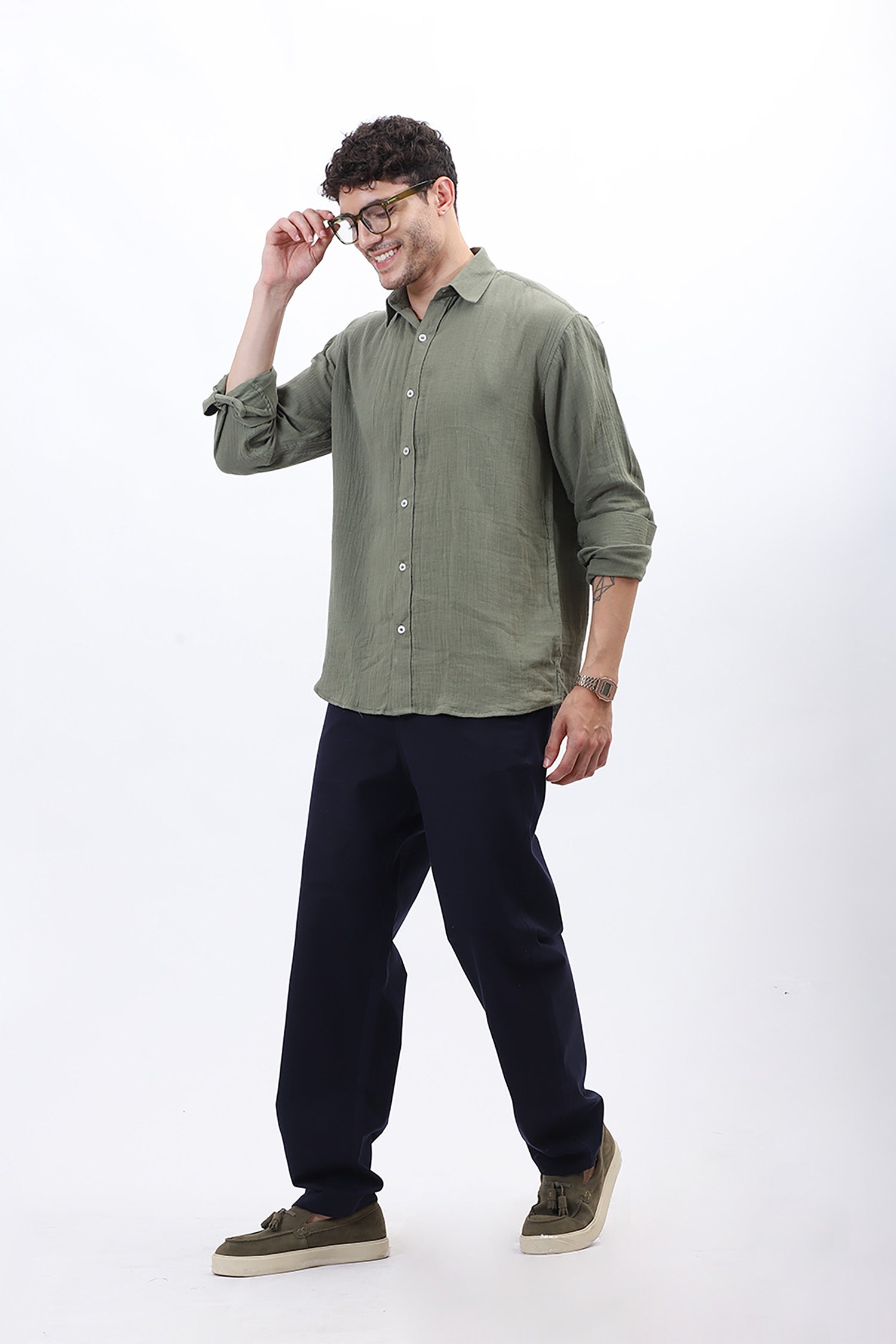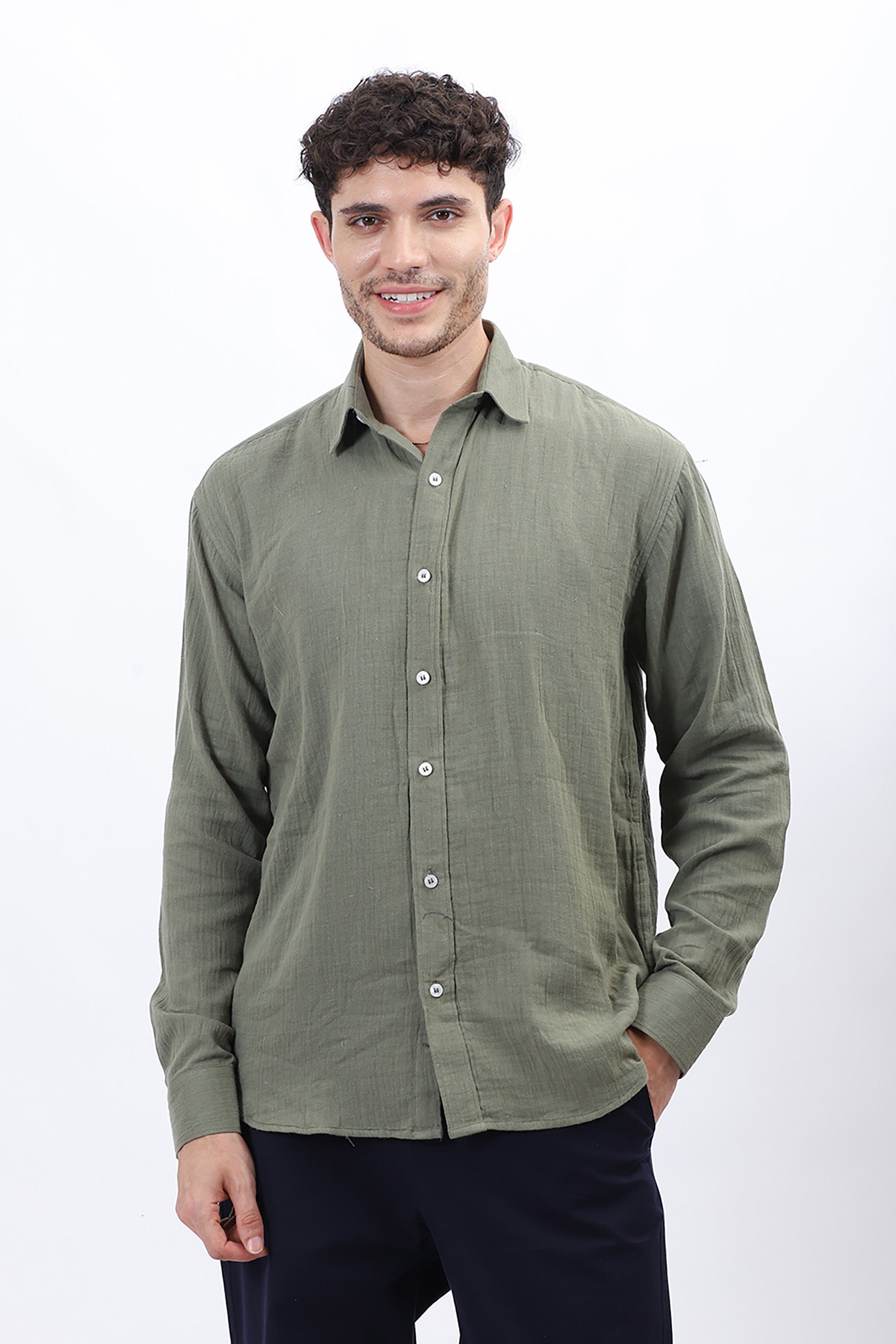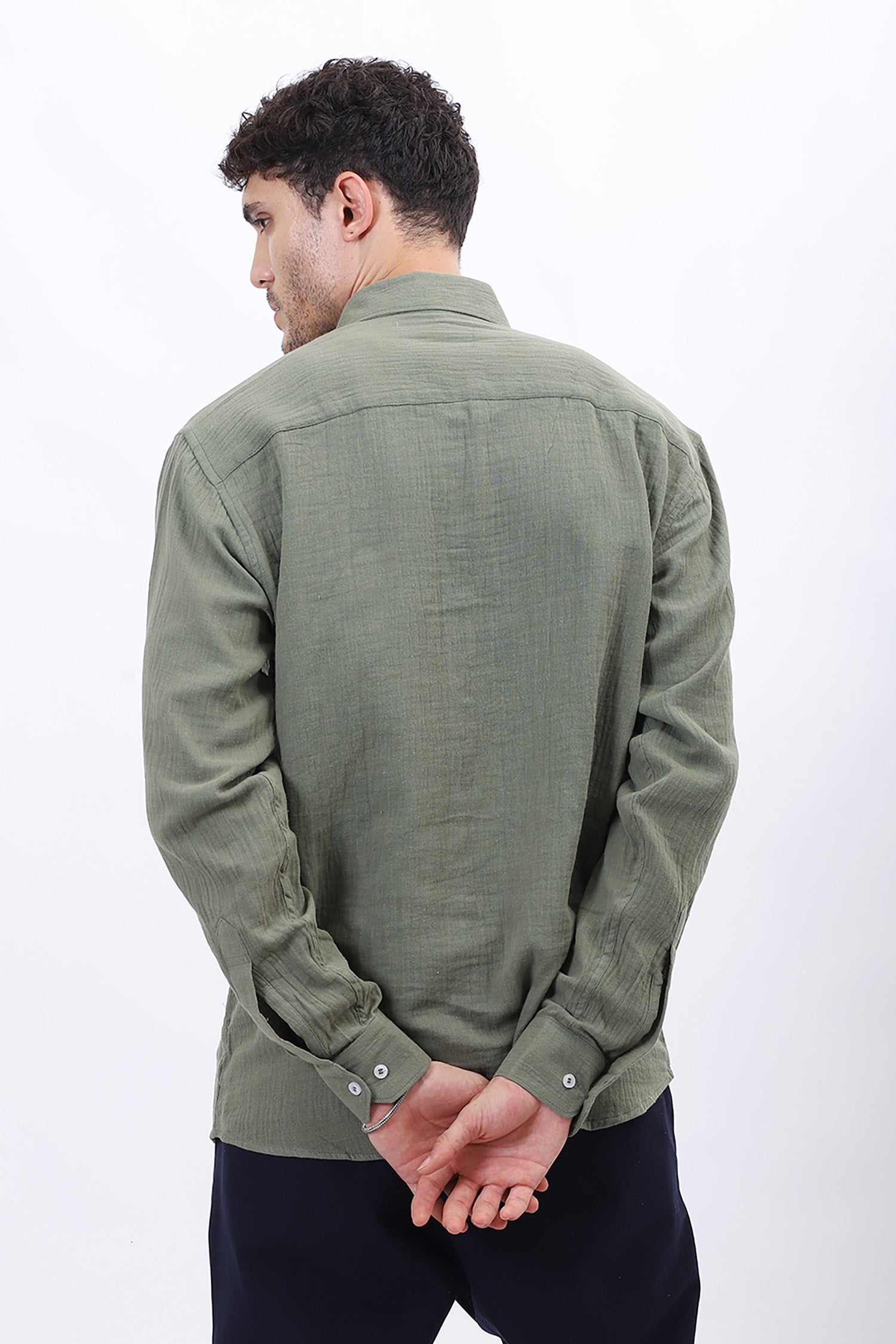 Stay effortlessly stylish with this Men’s Olive Green Casual Shirt, crafted from soft textured cotton for all-day breathability and comfort. Featuring a button-down front, standard collar, and double-button cuffs, this shirt blends a relaxed fit with refined detailing. The natural creases and lightweight fabric offer a laid-back, lived-in look that’s perfect for everyday wear.