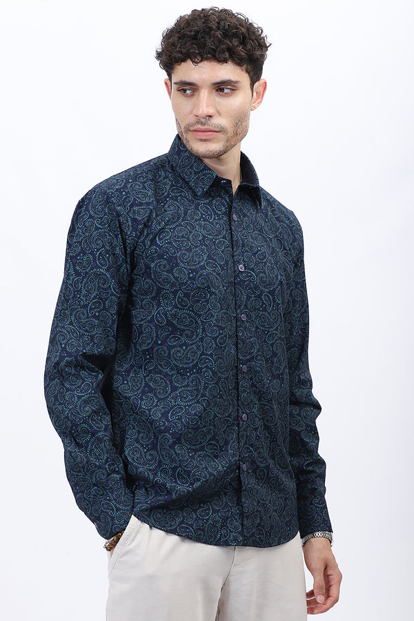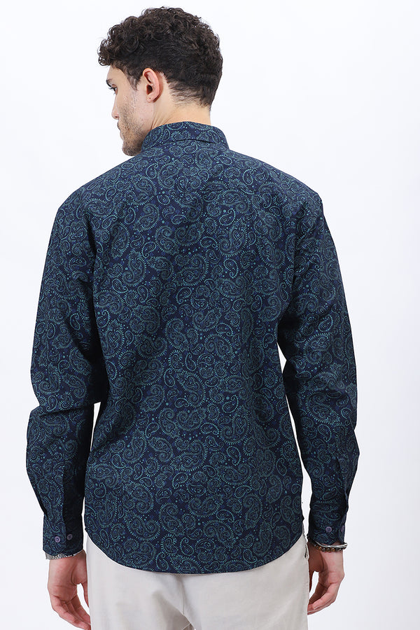 A modern shirt with timeless flair, this blue motif-printed shirt brings together detailed paisley patterns and subtle contrast elements. Designed in breathable cotton with a softener wash for extra comfort, it features a regular collar with contrast, French placket, and statement cuffs that add polish to your smart-casual wardrobe.