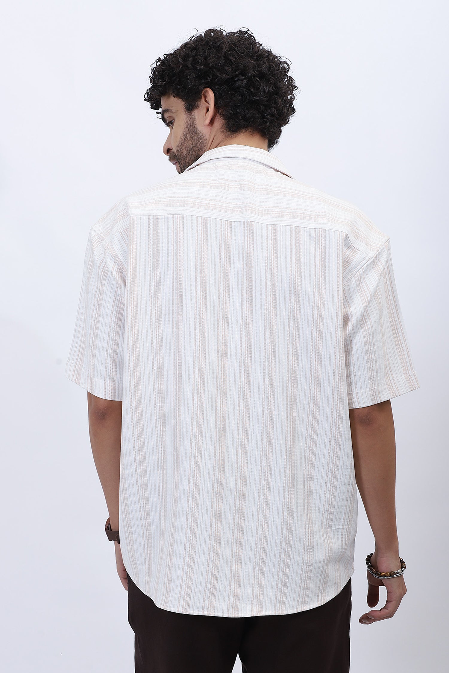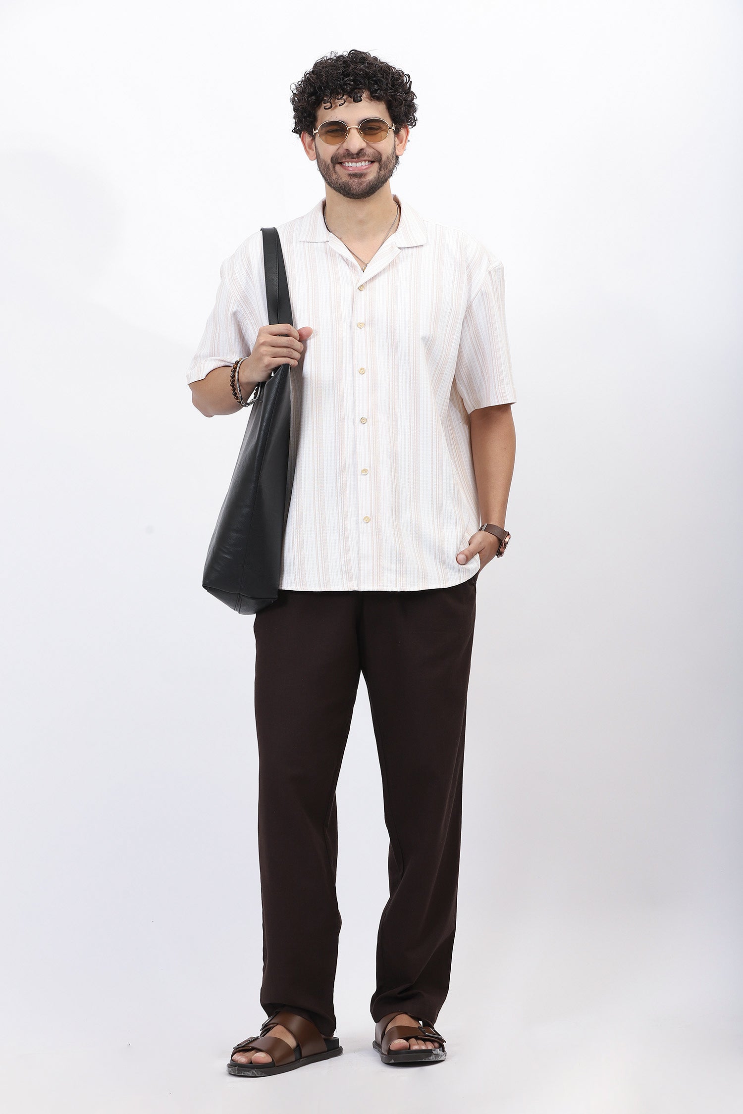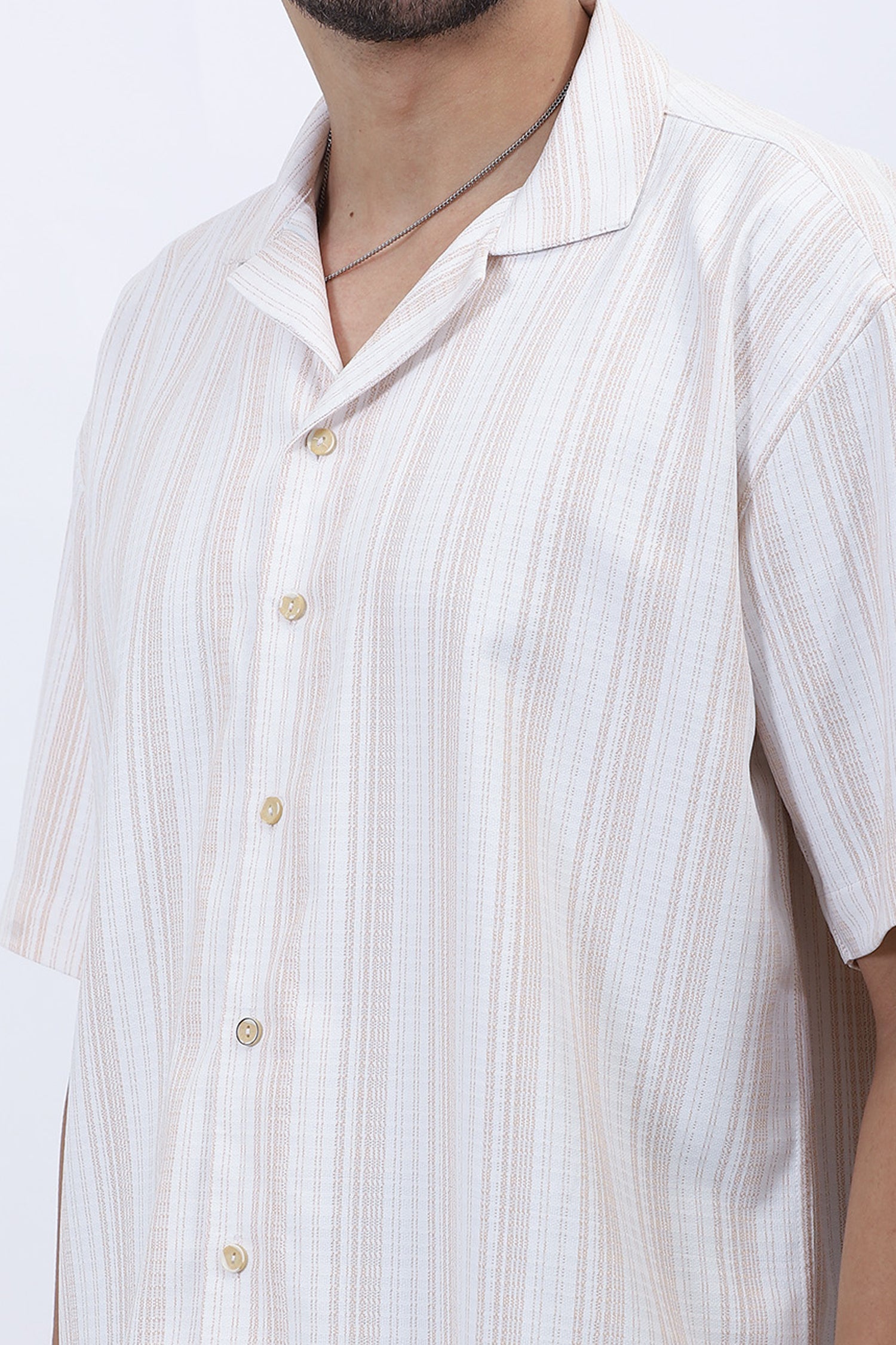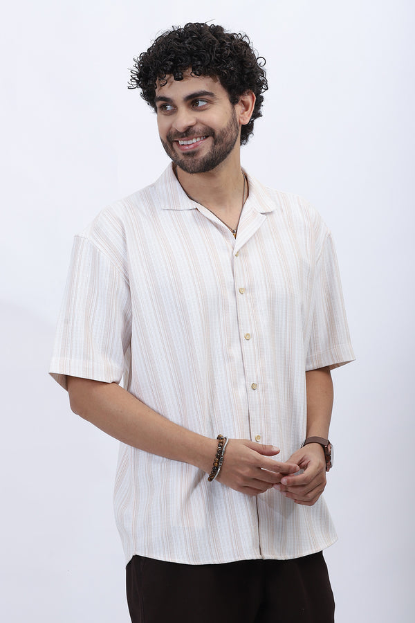 Designed for breezy days and easy vibes, this beige and white vertical striped shirt is the ultimate summer staple. Featuring a relaxed Cuban collar and short sleeves, it delivers a clean yet laid-back aesthetic. Made from a soft, breathable fabric with subtle texture, it’s ideal for those who love a touch of elegance even in their casualwear.