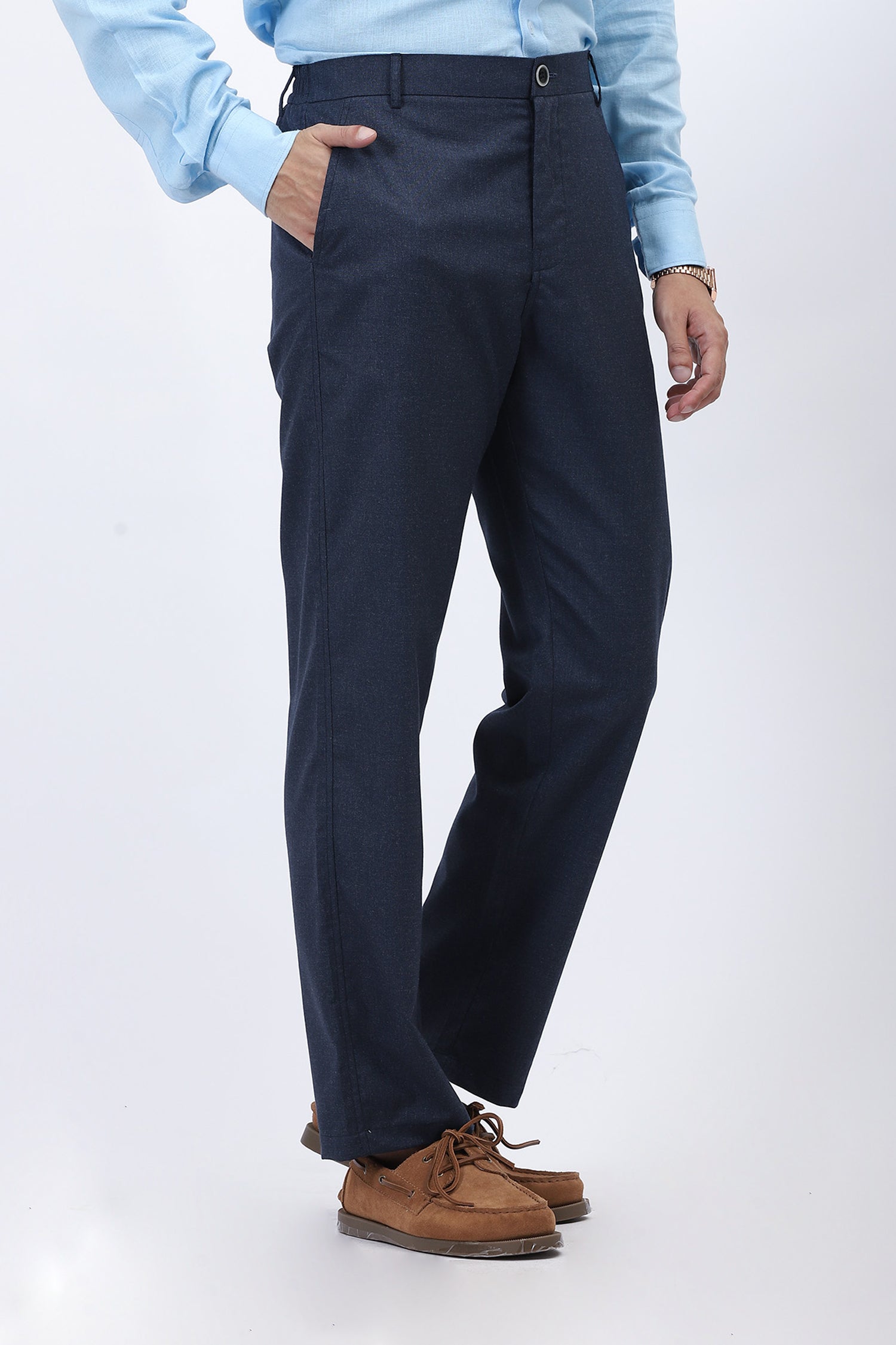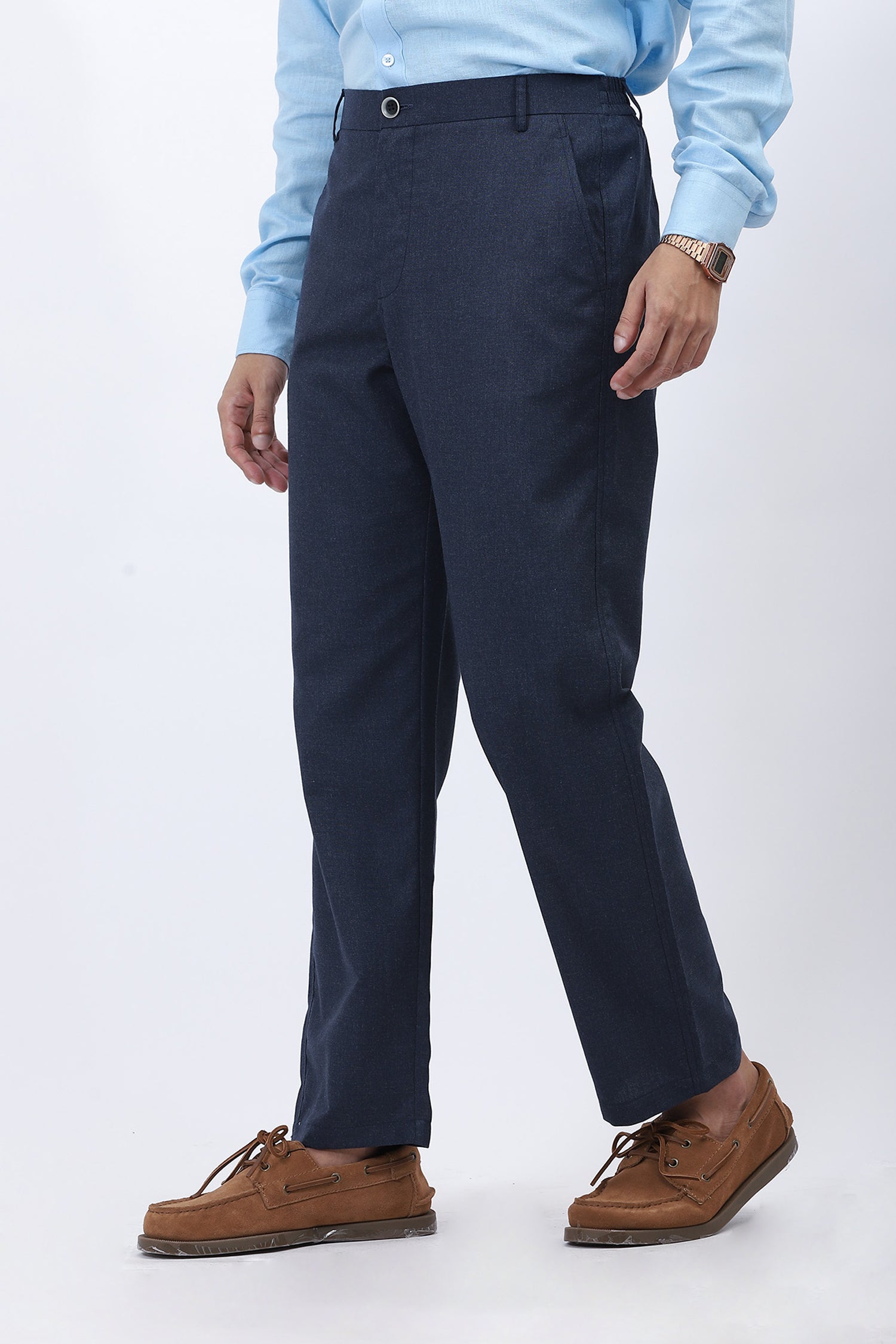 Classic straight-fit trousers in a deep navy/charcoal shade, designed for both professional and semi-formal occasions. Made from a smooth woven fabric, these trousers feature a flat front, side pockets, back welt pockets, and belt loops for a polished finish.