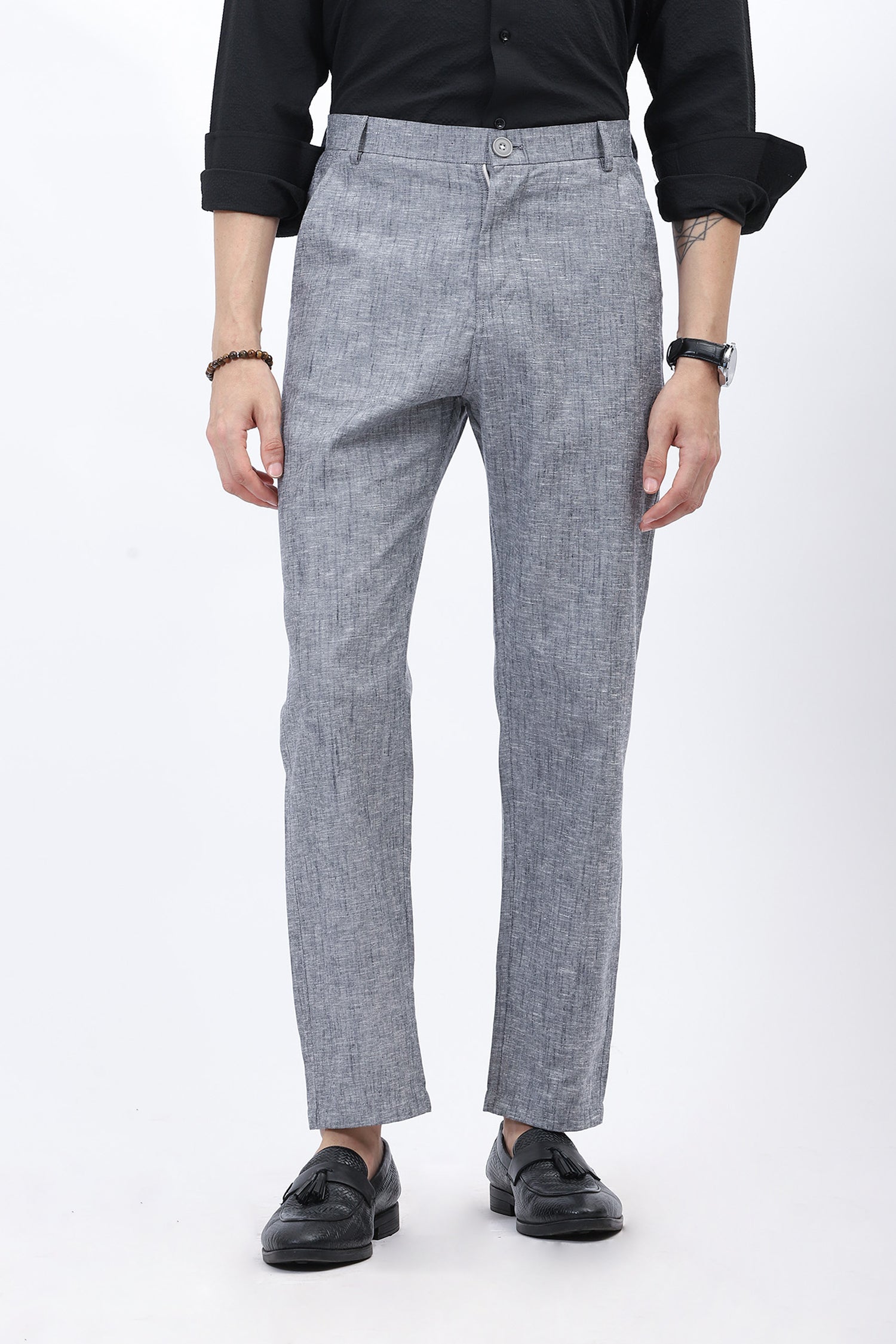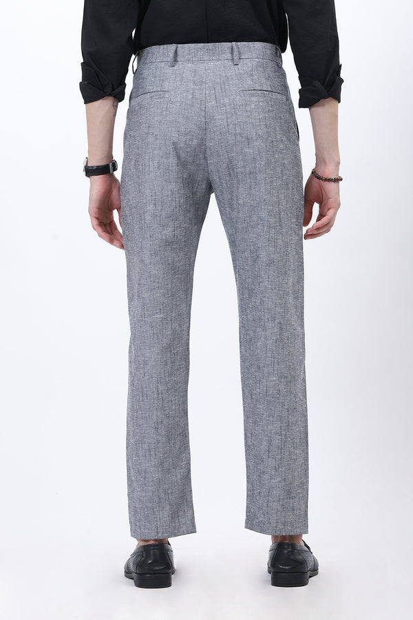 Sophisticated light grey trousers crafted from a breathable woven fabric with a subtle texture. Designed with a flat front, slanted side pockets, and back welt pockets, these trousers combine modern tailoring with everyday comfort. The neutral grey tone makes them versatile for multiple occasions.