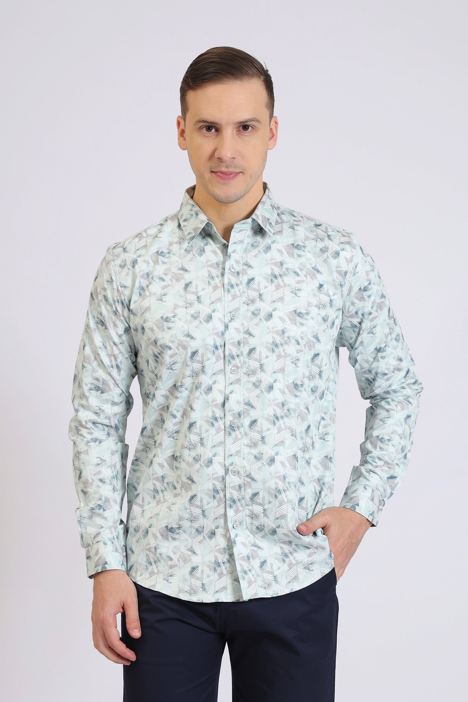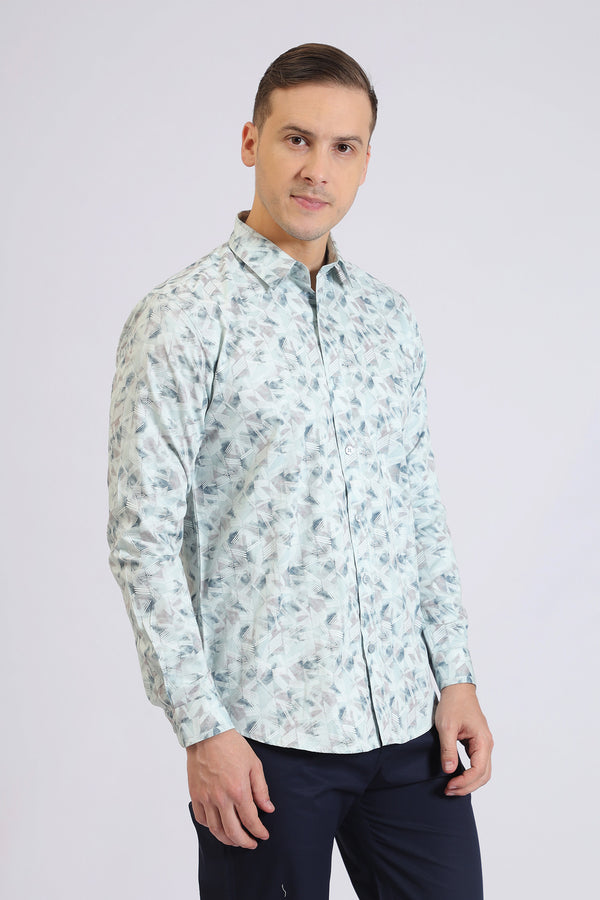 Elevate your style with our Sky Geometric Printed Cotton Shirt. Crafted in a comfortable regular fit with full sleeves, this shirt is made from soft and breathable 130 GSM cotton for all-day comfort. Featuring a modern sky-blue geometric print and crafted in-house, it’s perfect for both casual and formal occasions.