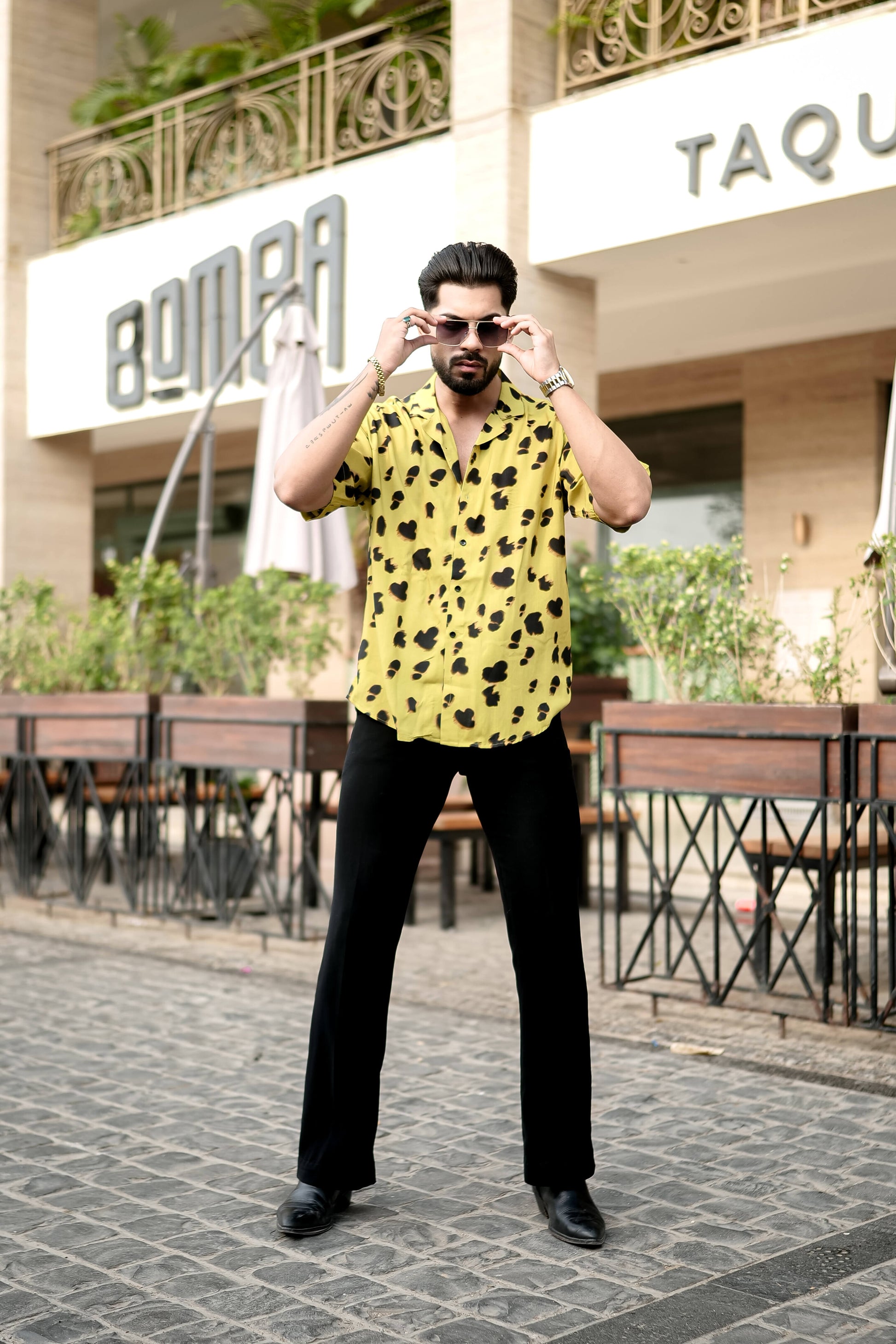 Unleash your bold side with this statement-making yellow leopard print resort shirt. Featuring an all-over black abstract animal pattern on a vibrant yellow base, this shirt is made for those who love to stand out. The relaxed fit and lightweight fabric make it ideal for vacations, beach days, or music festivals.